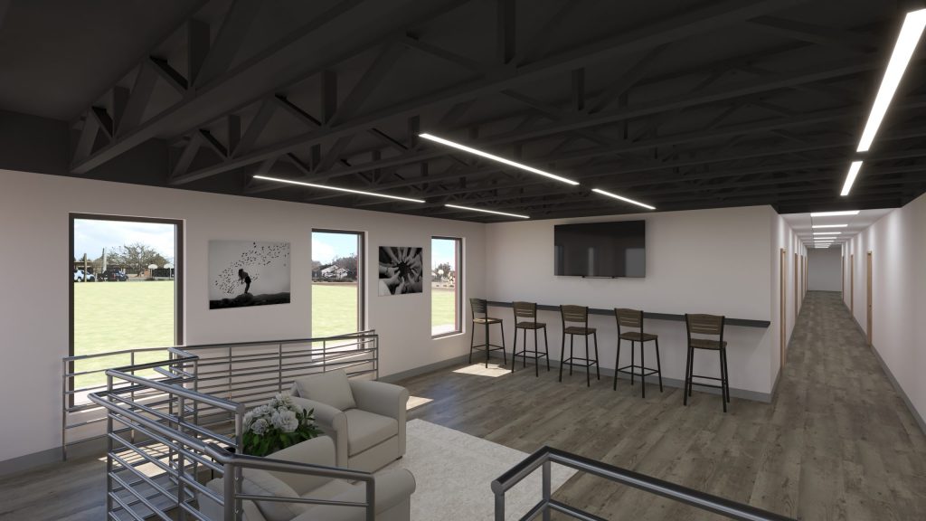The construction scope is to include a new ceiling design, new lighting, modified mechanical ductwork, new flooring, and adapting power outlet locations to address the new layout for proposed furniture and equipment.