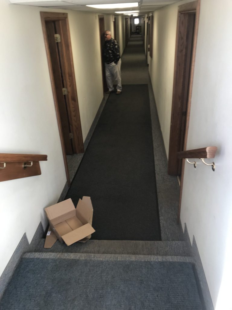 The building currently has an existing hollow metal door that opens to a parking lot which is separated from the building by an alley. On the inside of this doorway, the ground floor is approximately two feet below grade with a 4 foot by 4 foot landing and a stairway leading into a long narrow hallway that stretches the length of the building.